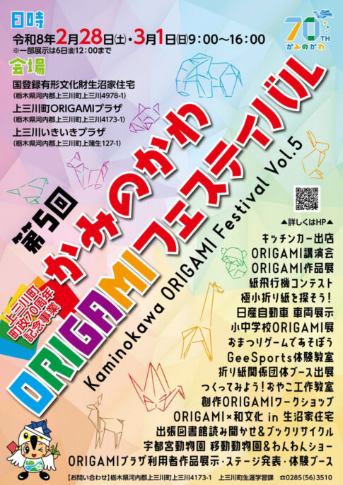 イベント上三川町の上三川町ORIGAMIプラザなど町内3会場で2月28日(土)、3月1日(日)に「第5回かみのかわORIGAMIフェスティバル」が開かれます。開催時間は、両日とも午前9時~午後4時までとなっています。※一部展示は...