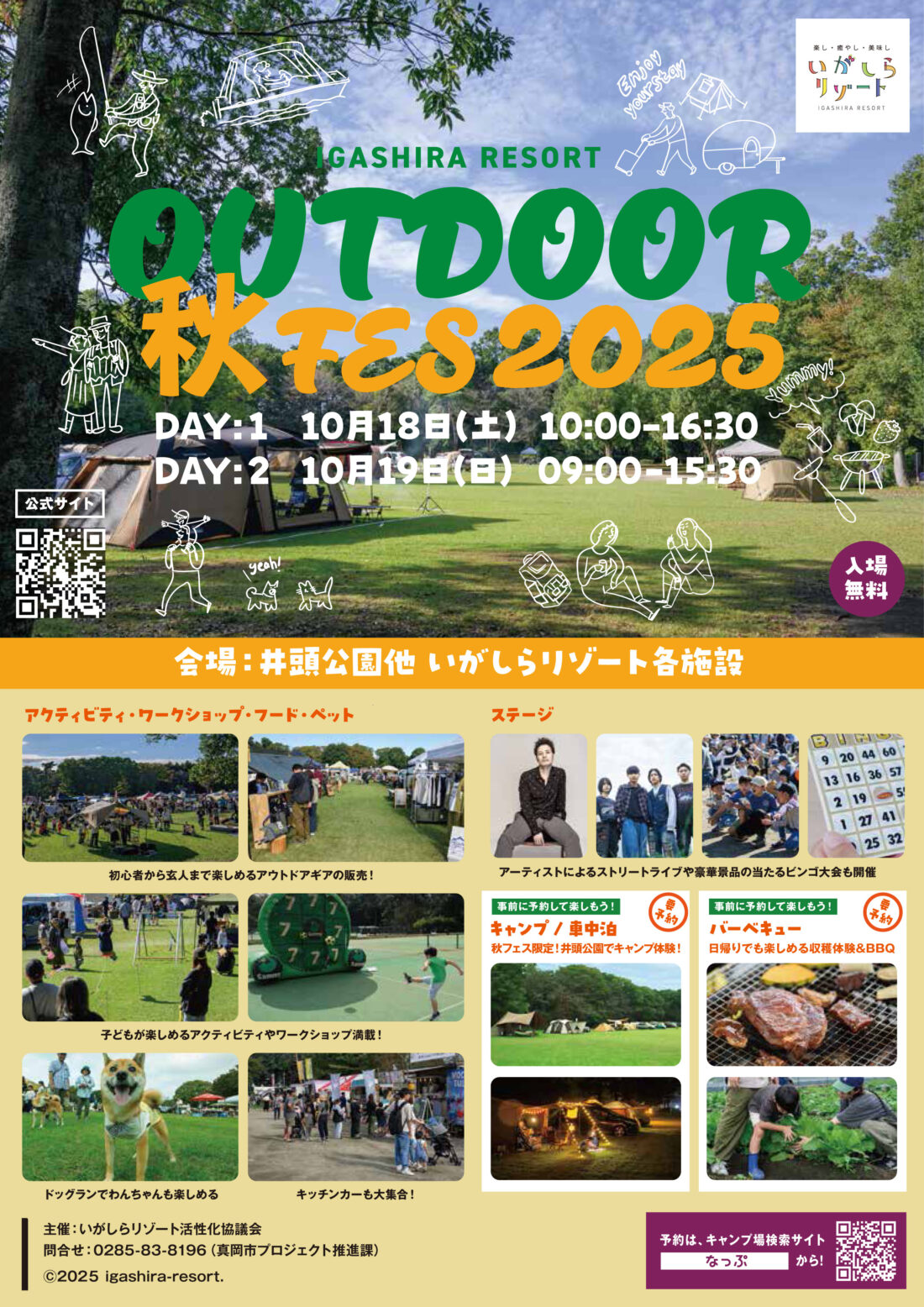 真岡市の井頭公園野球場をメイン会場に10月18日(土)、19(日)に、いがしらリゾート「アウトドア秋フェス」が開催されます。