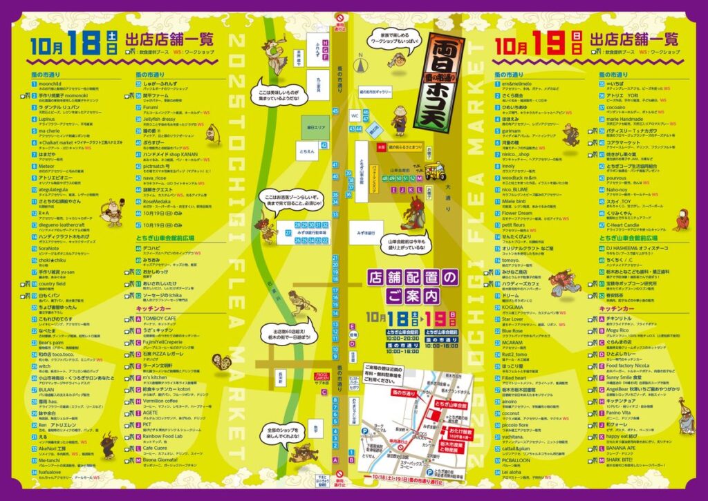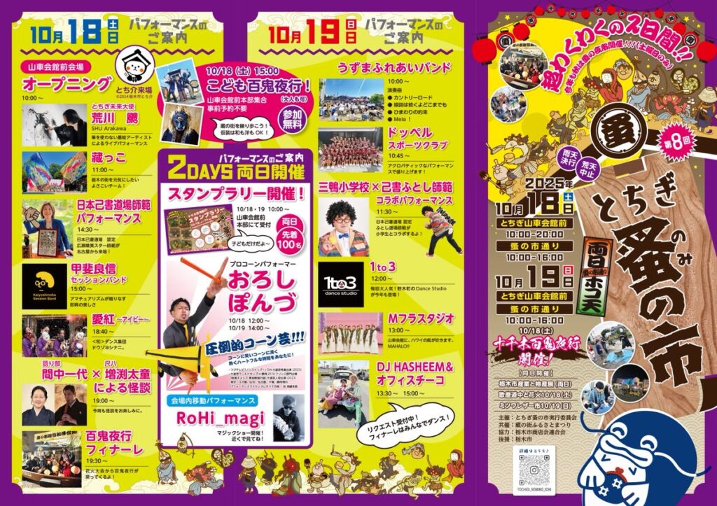 イベント2025.10.16【栃木市】「とちぎ蚤の市」が10/18(土)、19(日)の2日間開催されます! ポスト シェア 送る Pocket 広告 10月18日(土)と19日(日)に、「第8回とちぎ蚤の市」が開かれます。会場は、とちぎ山車会館と蚤の市通りです。開催時間は、初日が午前10時~午後8時(蚤の市通りは午後4時まで)、2日目は午前10時~午後4時までとなっています。 2日間、楽しめるイベントとなっておりますので、都合の合う方はぜひ、遊びに出掛けてみてください♪♪ イベントの詳しい内容は、こちらをご確認ください! 広告広告