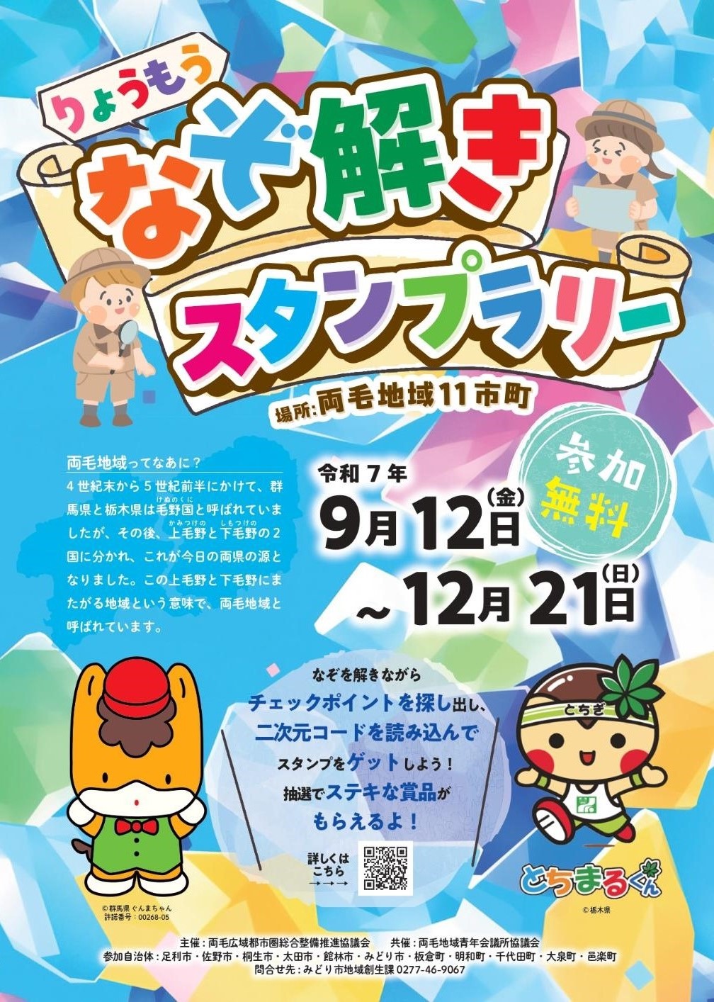 現在、両毛地域を巡って、各市町のなぞを解きつつ地域の魅力に触れる「りょうもうなぞ解きスタンプラリー」が開催されています。