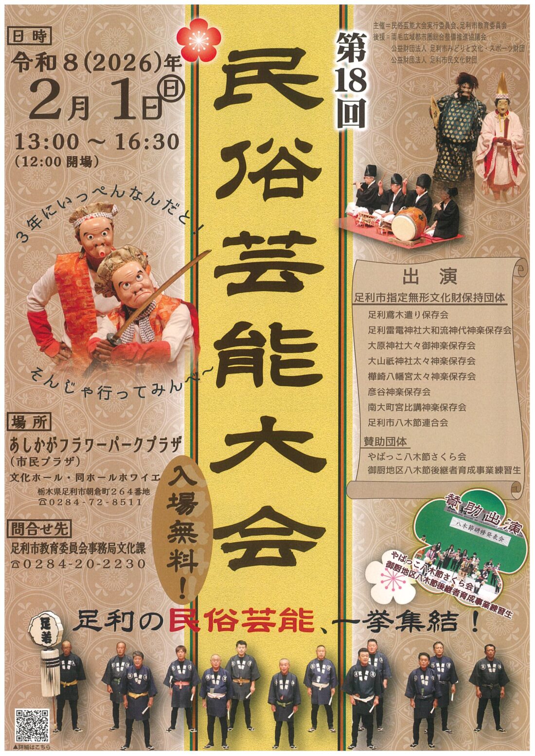 「第18回民俗芸能大会」が2月1日(日)、あしかがフラワーパークプラザ(足利市民プラザ)文化ホール(足利市朝倉町264)で開催されます。