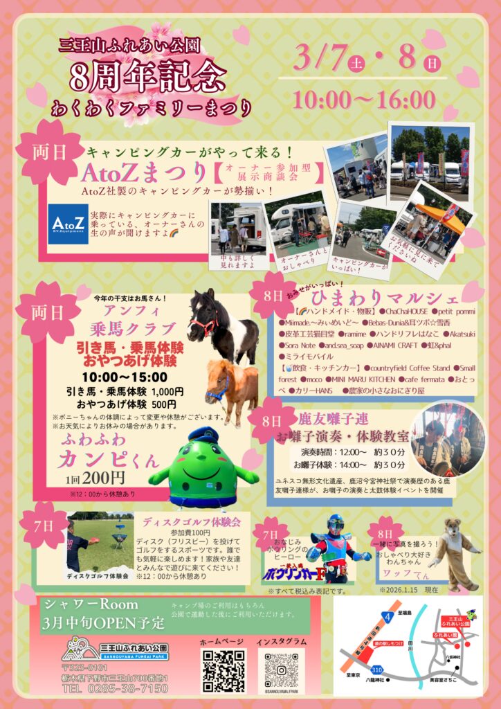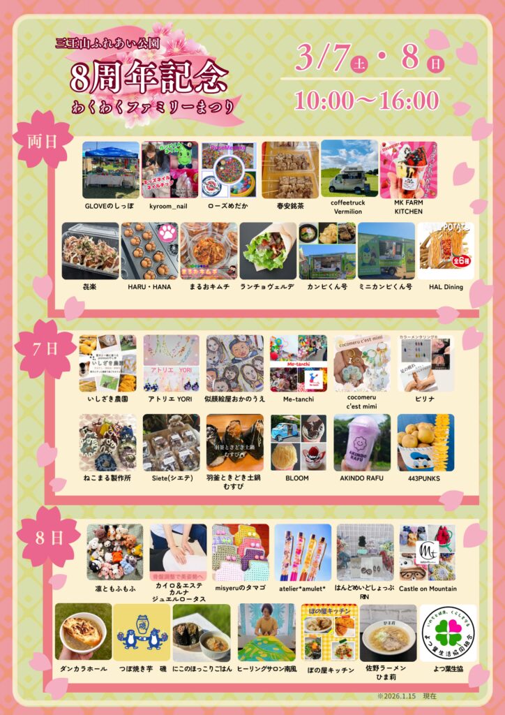イベント2026.03.04【下野市】三王山ふれあい公園で「8周年記念わくわくファミリーまつり」が3/7(土)、8日(日)に開催されます! ポスト シェア 送る Pocket 広告 下野市三王山の三王山ふれあい公園で、3月7日(土)、8日(日)に「8周年記念わくわくファミリーまつり」が開催されます。開催時間は、両日とも午前10時~午後4時までとなっています。 会場では2日間、多彩なイベントが行われる予定となっております。ぜひぜひ、遊びに出掛けてみてください♪ ●詳しい内容は、こちらからご確認ください! 広告広告