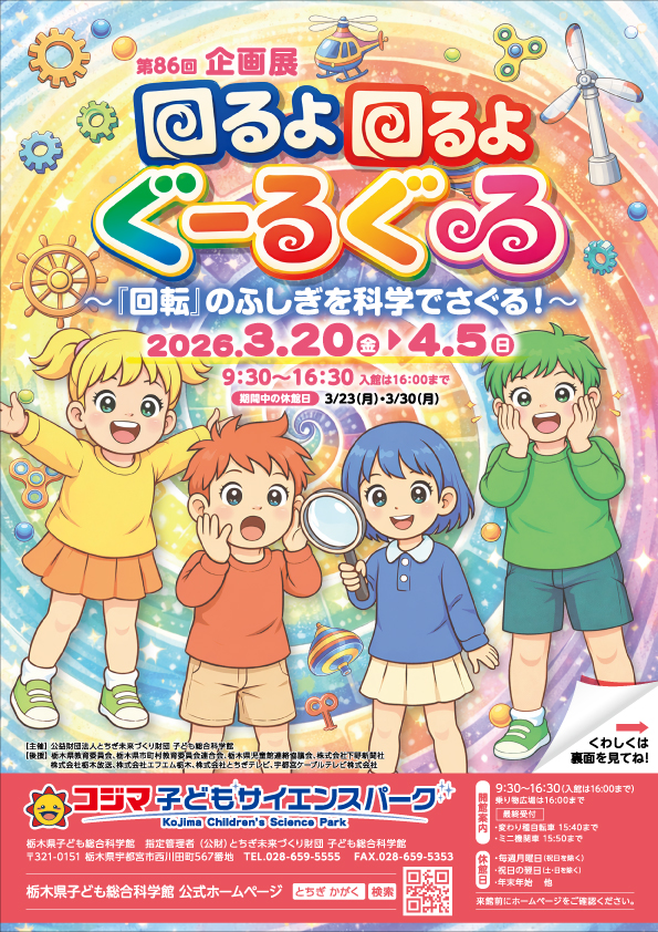 宇都宮市西川田町のコジマ子どもサイエンスパーク(栃木県子ども総合科学館)では4月5日(日)まで、第86回企画展「回るよ回るよぐーるぐる~『回転』のふしぎを科学でさぐる!~」が開催されています。