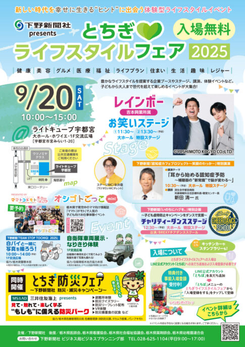 新しい時代を幸せに生きる“ヒント”に出会う体験型ライフスタイルイベント「とちぎライフスタイルフェア2025」が9月20日(土)、宇都宮市のライトキューブ宇都宮(宇都宮市宮みらい1-20)にて開催されます。開催時間は、午前...